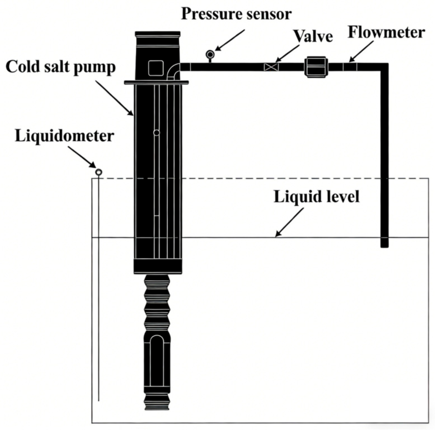 The hydraulic performance parameters of the cold salt pump were acquired under various operating conditions. Prior to formal testing, air was purged from the pump system, and checks for vibration and seal integrity were performed. During the performance tests, data including outlet pressure, flow rate, rotational speed, and input power were recorded at designated monitoring points. Each operating point was tested three times, and the collected data were subsequently fitted for analysis.