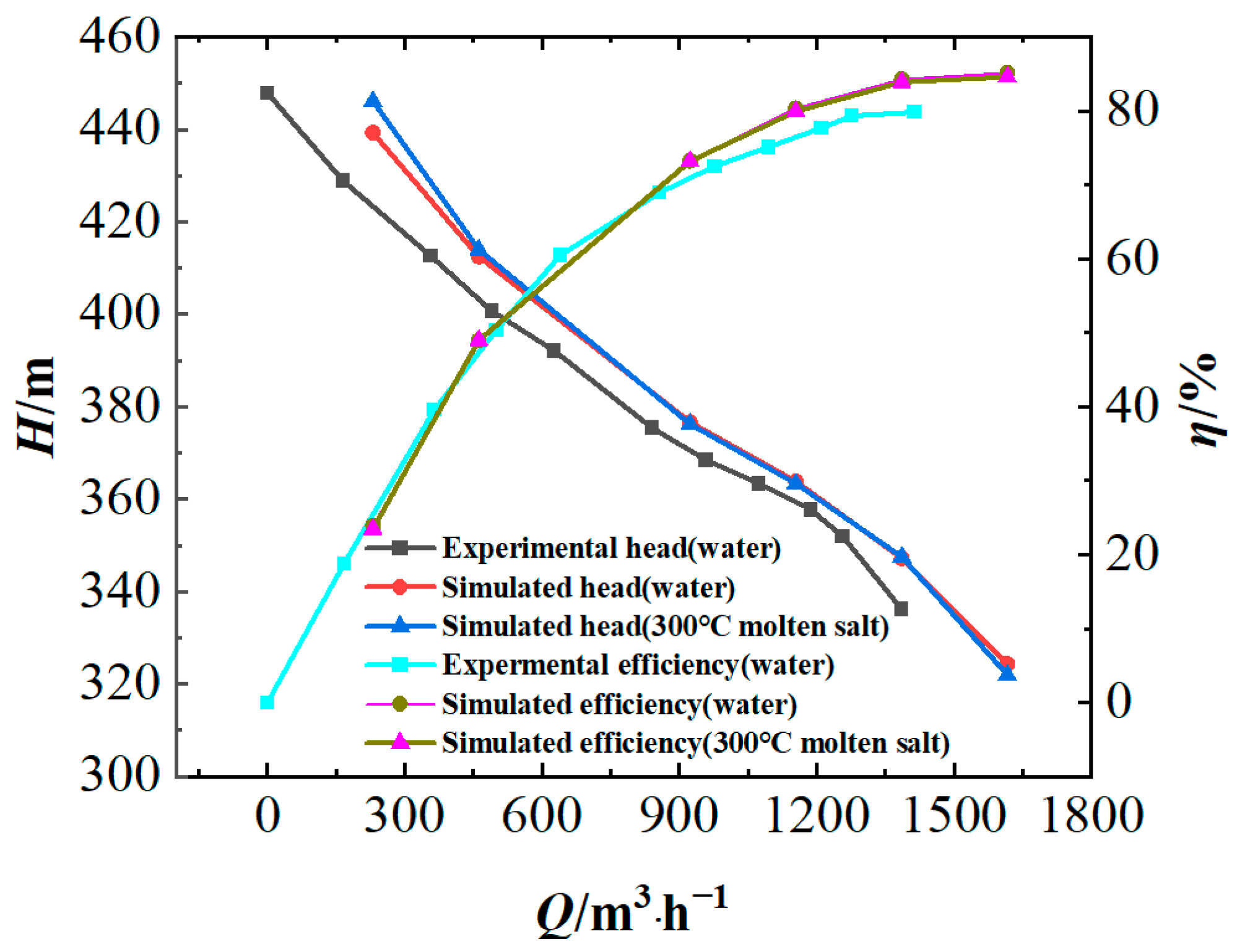 Regarding efficiency, the water test yields higher efficiency than the simulations at low flow rates, but lower efficiency at high flow rates. At the rated condition, the difference between experimental and numerical efficiencies remains within 5%. Based on economic and safety considerations, water is therefore adopted as the test medium for subsequent performance validation of this cold salt pump model.