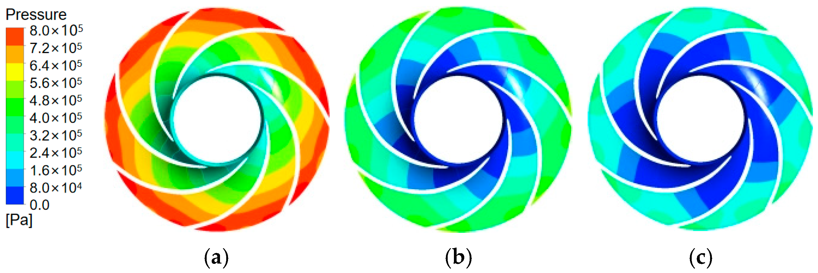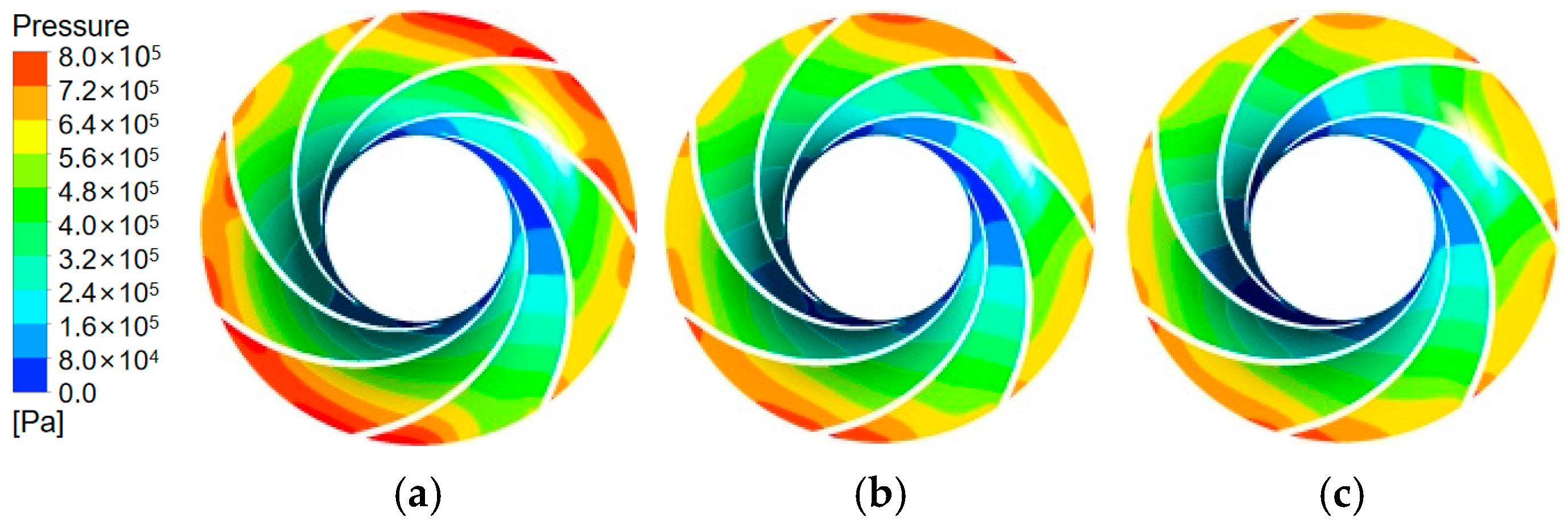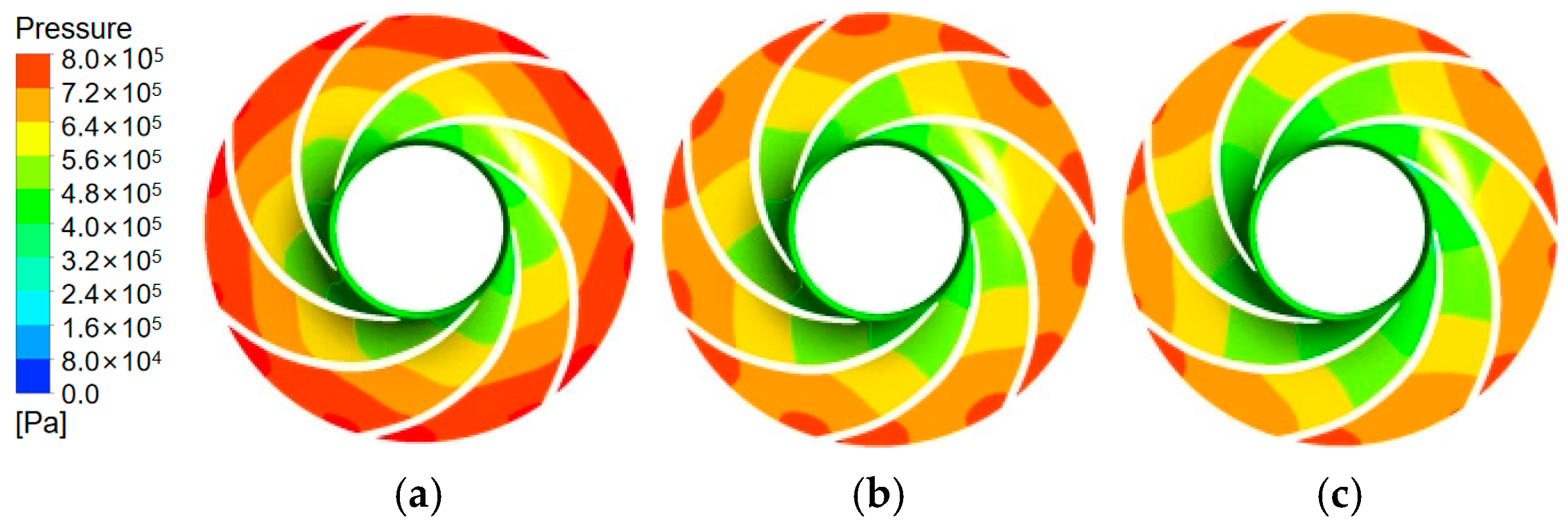 max = 0.93 under operating conditions, satisfying the accuracy criterion for transient flow resolution. The total simulation time covered 25 impeller revolutions (1.0135135 s). A residual convergence criterion of 1 × 10