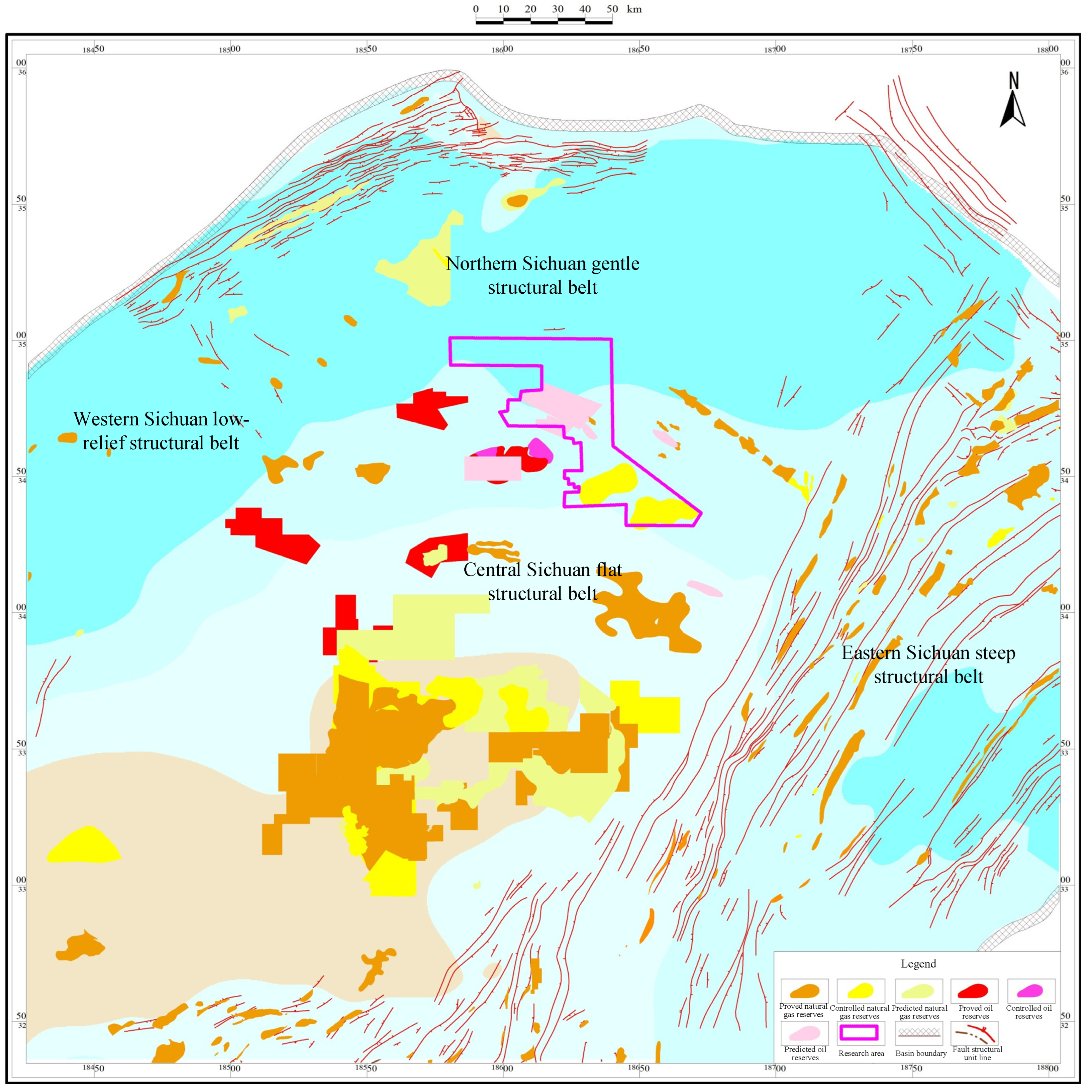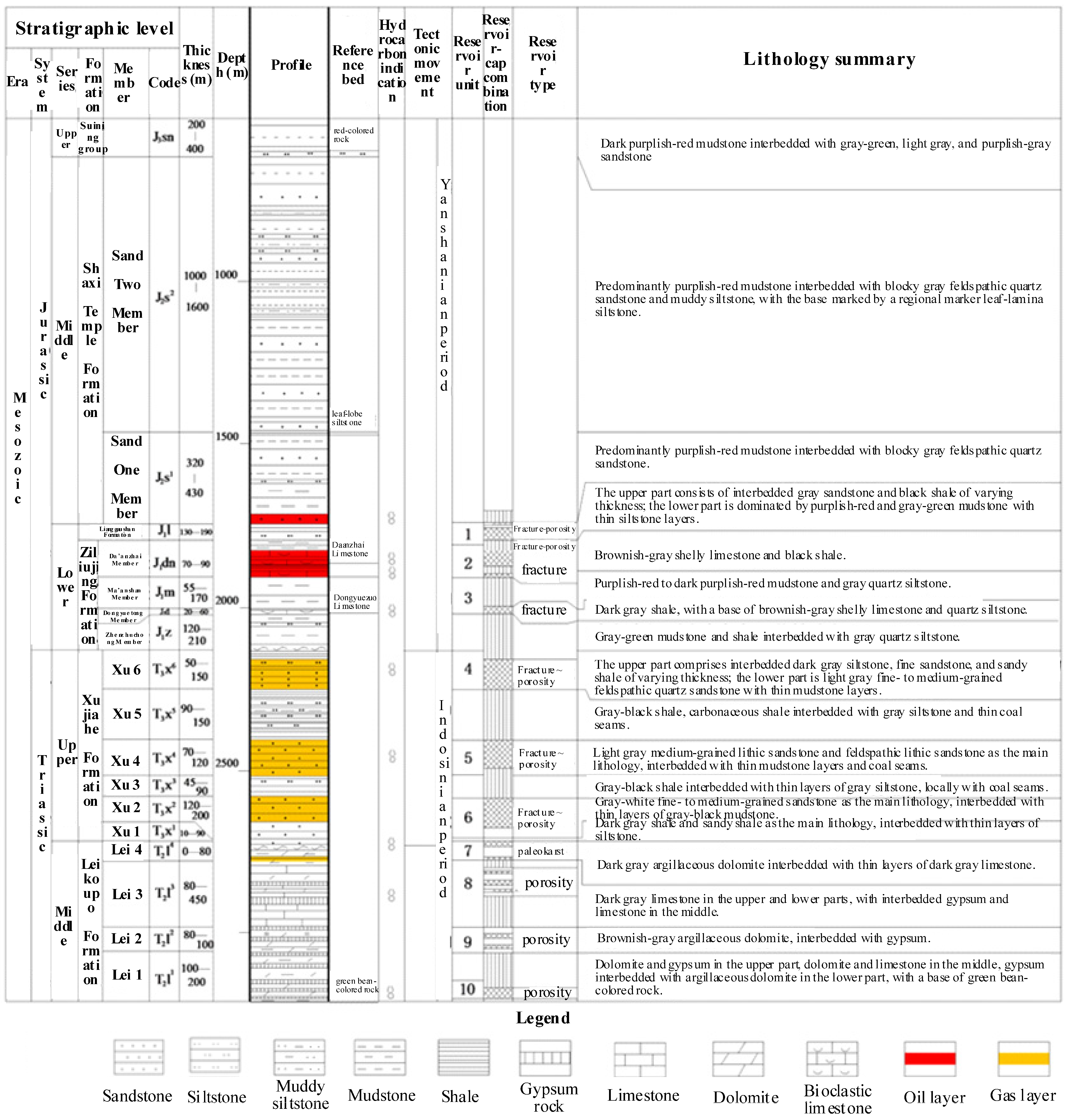 2]. This foreland setting is mainly reflected by the development of broad, gentle detachment-controlled folds, thin-skinned structural styles, and long-term compressional deformation related to peripheral orogenic belts, rather than by strongly developed syn-tectonic growth strata. The Yingshan area is located in the transitional zone between the gentle structural belt of central Sichuan and the fold belt of northeastern Sichuan [