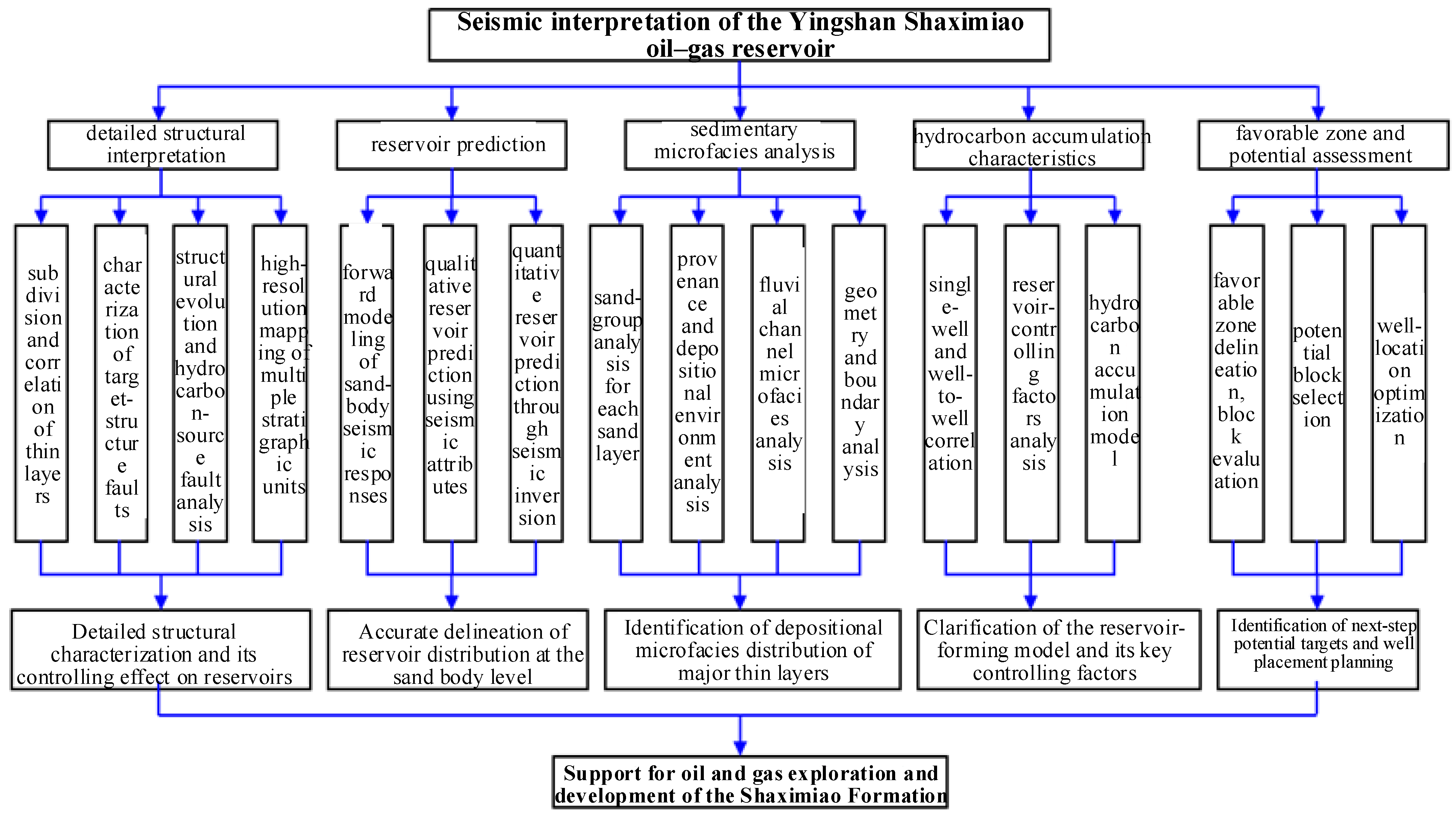 In this study, we developed the geological complexity of the Yingshan Shaximiao oil–gas reservoir by adopting an integrated research approach of “from macro to micro, from structure to reservoir, and from qualitative to quantitative.” A systematic workflow—combining structural interpretation, reservoir prediction, and hydrocarbon accumulation analysis—was established, as illustrated in