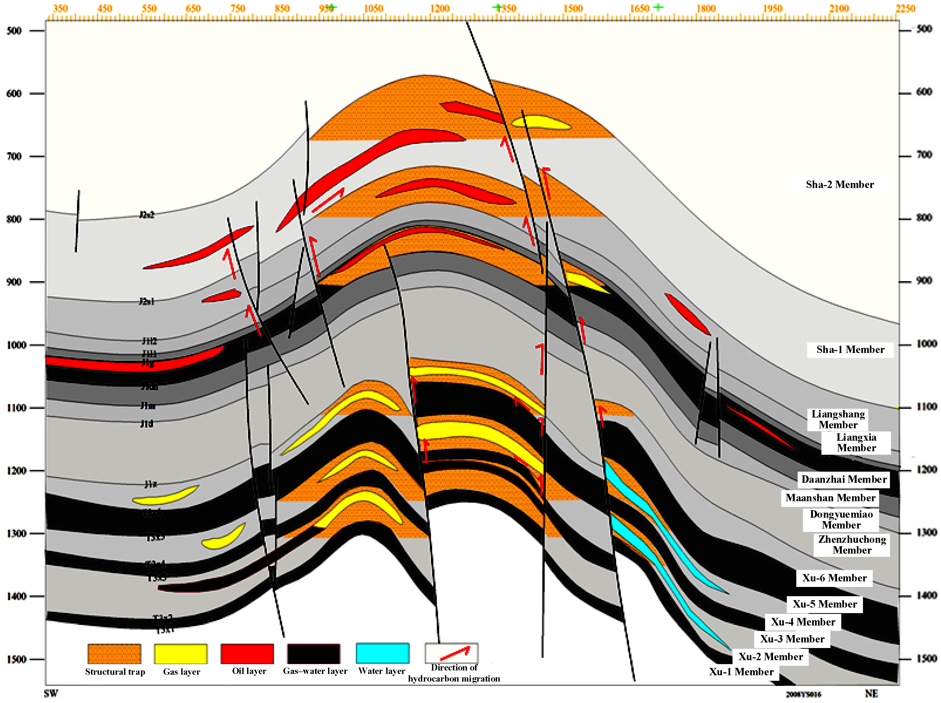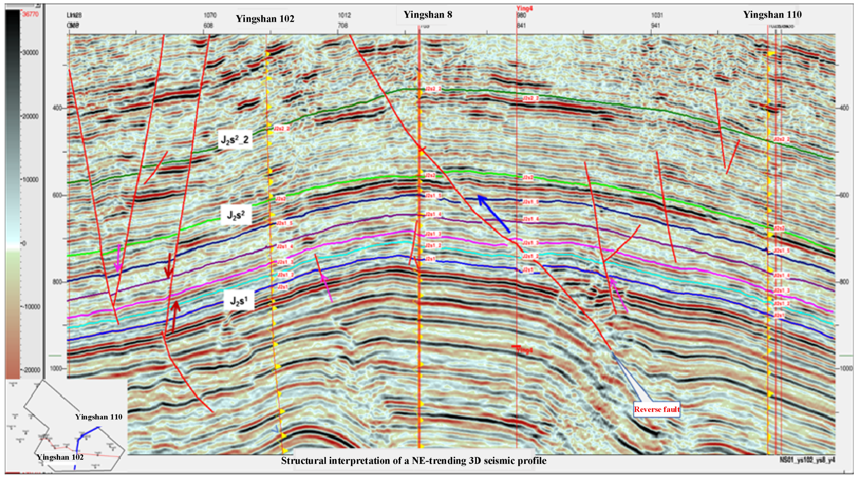 Figure 6. The integrated interpretation shows that the Yingshan anticline is overall continuous and complete. Several small-scale normal faults are identifiable at the flanks, potentially connecting deep hydrocarbon source rocks with overlying reservoirs, serving as local vertical migration pathways and lateral sealing units. This fault framework provides spatial constraints for subsequent trap evaluation and favorable-zone delineation.