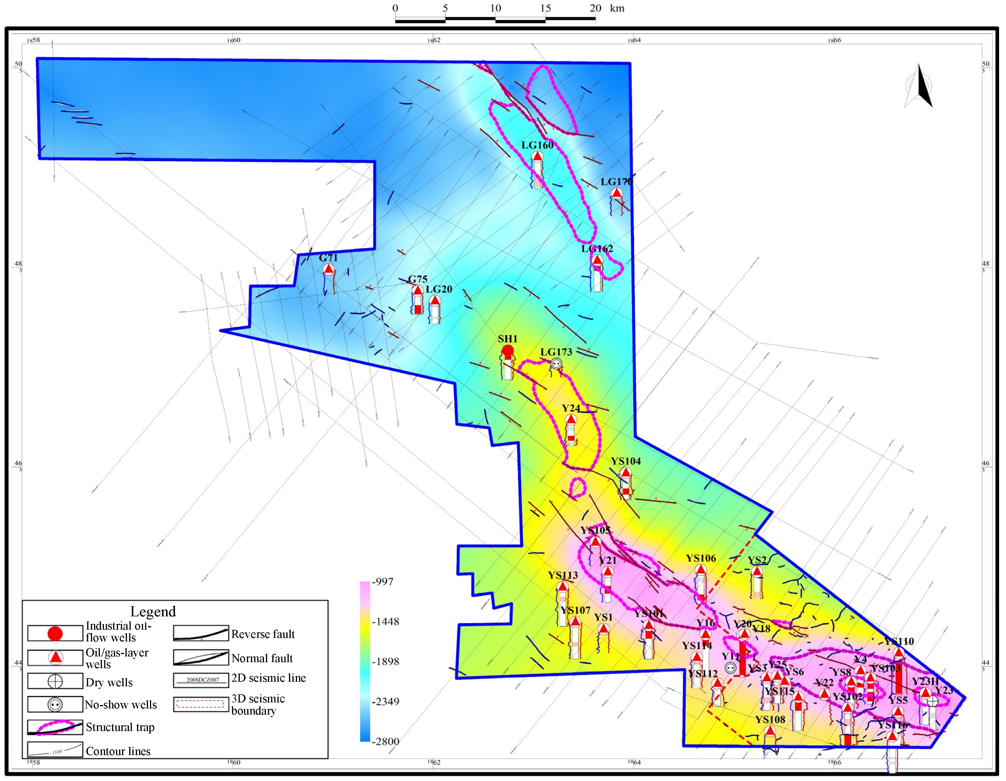 First, a first-order fault–fold framework was established on conventional pre-stack and post-stack sections. Subsequently, voxel-scale discontinuity and geometric attributes were computed, including coherence and its improved algorithms [