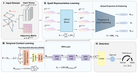 The core contribution of this research lies in the synergistic integration of GATv2Conv for dynamic spatial attention and a sequential temporal module with self-attention and GRU layers. This design not only achieves superior detection performance but also provides a more interpretable model that mirrors the physical propagation characteristics of the FDIAs. Experimental results on IEEE test systems provide compelling evidence of the method’s efficacy. The proposed FDIA detection method achieves a precision of 100% on the IEEE 14-bus and IEEE 118-bus systems, demonstrating its exceptional ability to eliminate false positives. However, the observed recall of 75.56% highlights the increased challenge of detecting attacks in larger and more complex topologies, which is a key limitation requiring further investigation.
