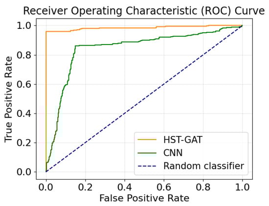 HST-GAT’s and CNN’s ROC curves on the IEEE 14-bus system.