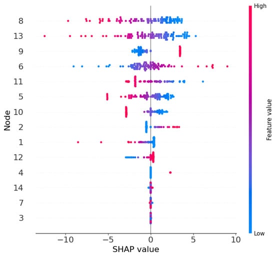 For nodes 8 and 13, high feature values primarily correspond to negative SHAP values, while low feature values correspond to positive SHAP values. This indicates that when the measurements of these nodes are high, the model tends to predict a normal state, leading to negatively impacting attack detection. Conversely, low measurements promote the detection of an attack. In contrast, for nodes 9 and 6, the low feature values correspond to the negative SHAP values, and the high feature values correspond to positive SHAP values.