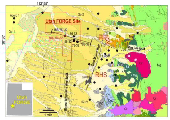 - Simmons, S.; Jones, C.; Kirby, S.; Wannamaker, P.; Pankow, K.; Moore, J. The interplay of impermeable crystalline basement rocks, tectonic fracturing, and magmatic intrusion in the development of geothermal resources at Utah FORGE and Roosevelt Hot Springs. In Proceedings of the 49th Workshop on Geothermal Reservoir Engineering (SGP-TR-227), Stanford, CA, USA, 12–14 February 2024; Stanford University: Stanford, CA, USA, 2024. [Google Scholar]