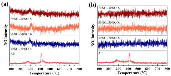 In contrast, the formation behavior of NO and NO2 is markedly altered under O2/CO2 oxygen-enriched atmospheres. The overall NO signal intensity is significantly reduced and only a weak peak is observed within the main combustion temperature region, with its peak position still corresponding to the primary DTG mass-loss interval. This indicates that NO formation under oxygen-enriched conditions is predominantly associated with the limited conversion of fuel nitrogen under intensified combustion. Meanwhile, NO2 signals under all oxygen-enriched atmospheres do not exhibit distinct peaks and remain at a low background level, suggesting that the further oxidation of NO to NO2 is strongly suppressed in the CO2-diluted environment.