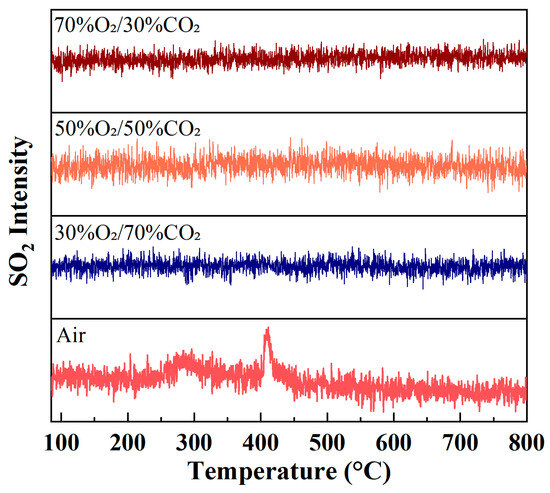 Under air conditions, the SO2 signal exhibits moderate fluctuations within the main combustion temperature region, accompanied by weak peak features. This suggests that sulfur contained in the fuel is gradually oxidized to SO2 during both the volatile release and char combustion stages. In contrast, under O2/CO2 oxygen-enriched atmospheres, the SO2 ion intensity is further reduced and shows a much smoother evolution profile, without any pronounced enhancement of peak intensity. Even at high oxygen concentrations, no significant increase in SO2 formation is observed.