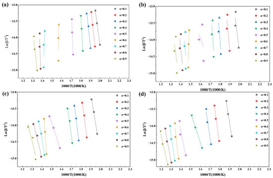 The iso-conversional linear fittings at different α values shown in Figure 7 and Figure 8 further reveal the restructuring of combustion control mechanisms induced by oxygen-enriched atmospheres. Under air and 30%O2/70%CO2 conditions, data points corresponding to each conversion degree are closely aligned with stable slopes, indicating that a single dominant control mechanism can reasonably describe the combustion process over a wide conversion range. The high R2 values reported in Table 4 support the statistical reliability of the corresponding E(α) values.