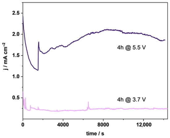The stability of TSO950@Ti under oxygen evolution conditions was tested at two potential values (3.7 V and 5.5 V vs. RHE), as shown in Figure 5. After the initial current drop (≈0.3j0), the electrode current leveled off around 0.25 mA/cm2 (at 3.7 V) and around 2 mA/cm2 (at 5.5 V) with intermittent current spikes. This is attributed to the expulsion of larger bubbles from the mesh, resulting in an increase in surface availability for the reaction. The absence of a decrease in current within 4 h of measurements points to the good stability of the surface TSO layer and its stability to catalyze oxygen evolution without structural change, as known to occur at higher potential, which leads to a decrease in activity [54,55].