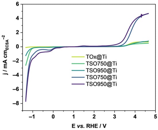 A wide potential window, above 4 V (Figure 6), shows that TSO950 and TSO850@Ti can fulfil both roles, i.e., H* generation at the cathode and OH* and SO4*− generation at the anode, which is essential in modern and efficient systems. High Tafel slope and good stability of surface modified titanium mesh suggest that it can serve as an excellent anode for pollutant degradation as measured for similar materials [42,56]. The ease of electrode preparation and their bifunctionality put them forward as promising materials for wastewater treatment.