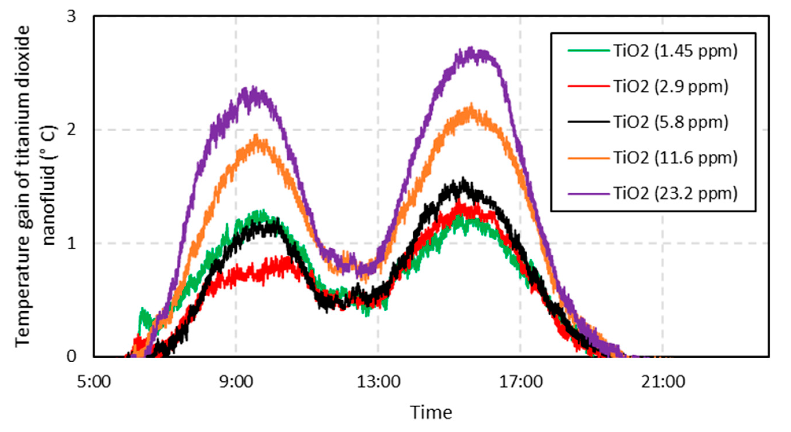 - At a maximum concentration (i.e., 23.2 ppm of TiO2), the nanofluid achieves an energy gain in relation to the base fluid of less than 10%, and the additional increase in concentrations did not imply any significant energy gain. This fact justifies not using higher concentrations, since 1.45 ppm already obtains similar results similar to those obtained with higher concentrations.