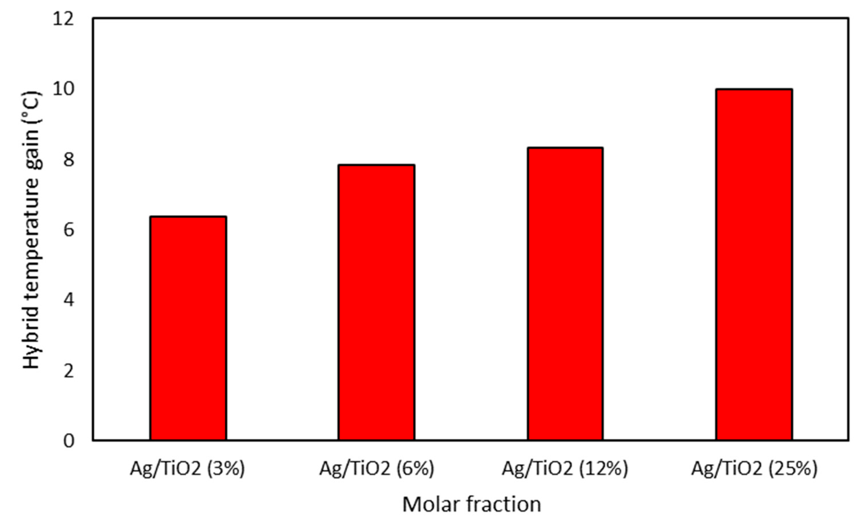 - Regarding temperature gain, titanium dioxide nanofluids were less effective than silver nanofluids and hybrid compounds. Silver obtained a gain of 10.22 °C in the nanofluid concentration of 3.5 ppm, while the hybrid obtained a gain of 9.97 °C in the molar fraction of 25%, indicating that higher molar fractions may not be advantageous for the hybrid compound, since silver alone leads to a better result.