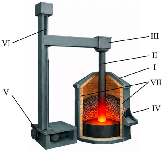 Schematic of a 100 kVA ore-thermal furnace. I—furnace casing (5 mm thick steel sheet); II—graphite electrode (Ø 100 mm); III—electrode holder; IV—power supply busbar; V—drive motor; VI—threaded rod for electrode positioning; VII—fireclay brick lining (working zone).