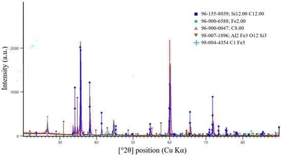 Weak diffraction maxima corresponding to iron-containing and aluminosilicide phases (Fe, Fe–Al–Si) were also observed. These phases are most likely formed due to impurity components present in the initial microsilica. The intensities of these peaks are significantly lower than those of the SiC reflections, indicating that they represent secondary impurity phases.