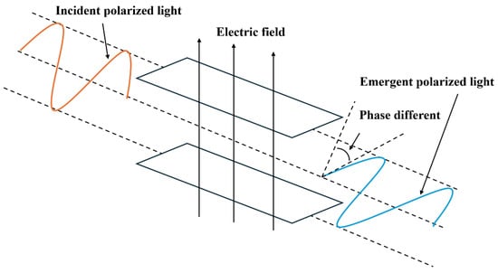 In Equation (1), Ii denotes the input light intensity, and Io represents the output light intensity. Em signifies the electric field strength at which the light intensity reaches its first maximum, also referred to as the half-wave field strength; this value depends solely on the Kerr constant and the effective length of the electric field region, as calculated by Equation (2).