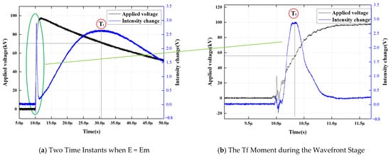 The parameters used for the calculation are defined as follows: t0: The wavefront time. E//: The applied voltage at the “Tf moment” under the condition where positive charges near the upper electrode and negative charges near the lower electrode maximally enhance the electric field within the oil gap. Ep: The peak applied voltage corresponding to the condition of maximal field enhancement (E// scenario). E/: The applied voltage at the “Tf moment” under the condition where the direction of E2− opposes E1, yet the resultant field (E1 + E2+ − E2−) reaches its maximum. En: The peak applied voltage corresponding to the condition described for E/.