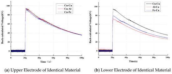 By synthesizing the horizontal comparisons (different metal electrode combinations under identical voltage) and vertical comparisons (identical metal configurations under varying voltages), the results are presented in Table 2 and Figure 14. Specifically, these data include the back-calculated voltages at t = 40 μs for various metal combinations under a 100 kV peak 2/25 μs impulse voltage with a 5 mm gap, as well as the applied voltages corresponding to the Tf moment for Cu-Cu and Al-Al configurations under varying applied voltages.
