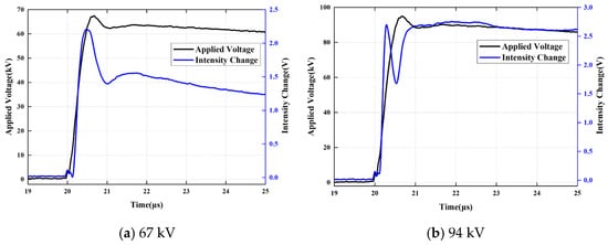 As indicated by Equation (2), the half-wave field strength Em depends exclusively on the Kerr constant and the length of the electric field region traversed by the laser. In the experimental setup employed in this study, the liquid dielectric is No. 25 transformer oil, characterized by a Kerr constant B = 3 × 10−15 m/V2 and an electrode length L = 1 m. According to the theory of electro-optic modulation, the critical electric field strength corresponding to the first complete phase reversal of the system (i.e., where the light intensity reaches its first maximum) is calibrated as Em = 12.9 kV/mm this value serves as the benchmark reference for the subsequent back-calculation of charge injection intensity. The light intensity achieves its maximum values when the magnitude of the composite electric field E successively reaches √1Em, √3Em, √5Em, ……, √nEm, where n is an odd integer. The composite electric field E is the superposition of the applied electric field E1 and the electric field E2 induced by space charges within the oil–paper insulation system, where E2 comprises contributions from positive charges (E2+) and negative charges (E2−). Consequently, the instants at which light intensity maxima occur correspond to the condition where E = Em. To record these transient variations, the modulated laser beam is captured by a linear photodetector, converting optical signals into electrical waveforms. This output is connected to Channel 1 of a digital storage oscilloscope, while the applied impulse voltage, measured via a capacitive divider, is connected to Channel 2. The two signals are synchronously triggered and digitized to ensure strict temporal alignment. Subsequently, the recorded optical intensity data is converted into electric field strength E(t) using the inversion calculation described in Equations (3) and (4). This study focuses on monitoring two critical dynamic time points: the Wavefront Response Peak and the Wavetail Recovery Peak, at which the composite electric field E equals Em. For quantitative characterization, the instant when the electric field strength first reaches the calibrated value Em during the wavefront phase (the wavefront response peak) is defined as the “Tf moment”; correspondingly, the instant when the electric field intersects Em again during the wavetail decay phase (the wavetail recovery peak) is defined as the “Tt moment”. Through time-alignment techniques, the actual applied voltage component E1 corresponding to these characteristic moments is extracted. In the context of oil–paper interface polarization, if the measured voltage E1 is lower than the calibrated field strength Em, it indicates a positive superposition effect of space charge on the macroscopic electric field (field enhancement); conversely, if E1 is higher, it suggests that the accumulation of homocharges induces a shielding attenuation effect. The results are illustrated in Figure 3. Unlike experiments conducted with pure oil gaps, this study introduces a dried insulating fiber paper layer between the parallel plates. This configuration necessitates that charges undergo an interface trapping process before migrating to the center of the oil gap, thereby altering the lag time associated with the appearance of characteristic peaks. Throughout the experimental process, the analysis focuses on the non-linear coupling mechanism between the applied electric field E1, generated by the impulse waveform, and the induced field E2, resulting from charge accumulation at the oil–paper interface.