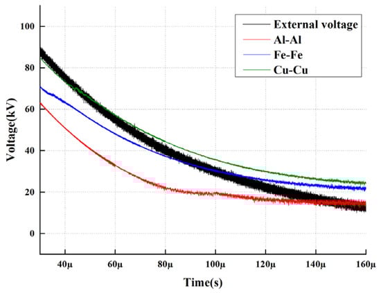 Visual Characteristic 1 (Deviation): Starting from t ≈ 20 μs, all measured curves begin to deviate downwards from the applied voltage trajectory, indicating the onset of the shielding effect. Visual Characteristic 2 (Divergence): The red curve (Al-Al) exhibits the steepest descent, detaching from the reference voltage earliest and reaching the lowest peak value (~70 kV), which corresponds to the strongest field distortion. Visual Characteristic 3 (Stability): In contrast, the green curve (Cu-Cu) closely tracks the black reference line throughout the wavefront, confirming its high fidelity in maintaining the electric field distribution.