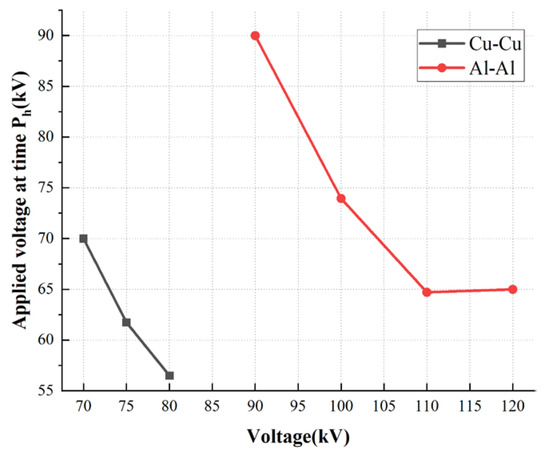 The preceding analysis indicates that the back-calculated electric field is minimized when the upper electrode is Aluminum, whereas it is maximized when the upper electrode is Copper. Consequently, the following section presents a comparative analysis of the applied voltages corresponding to the condition where the composite electric field E within the oil gap equals Em (specifically at the “Tf moment”) under a 2/25 μs impulse voltage, focusing on the Al-Al and Cu-Cu electrode configurations.