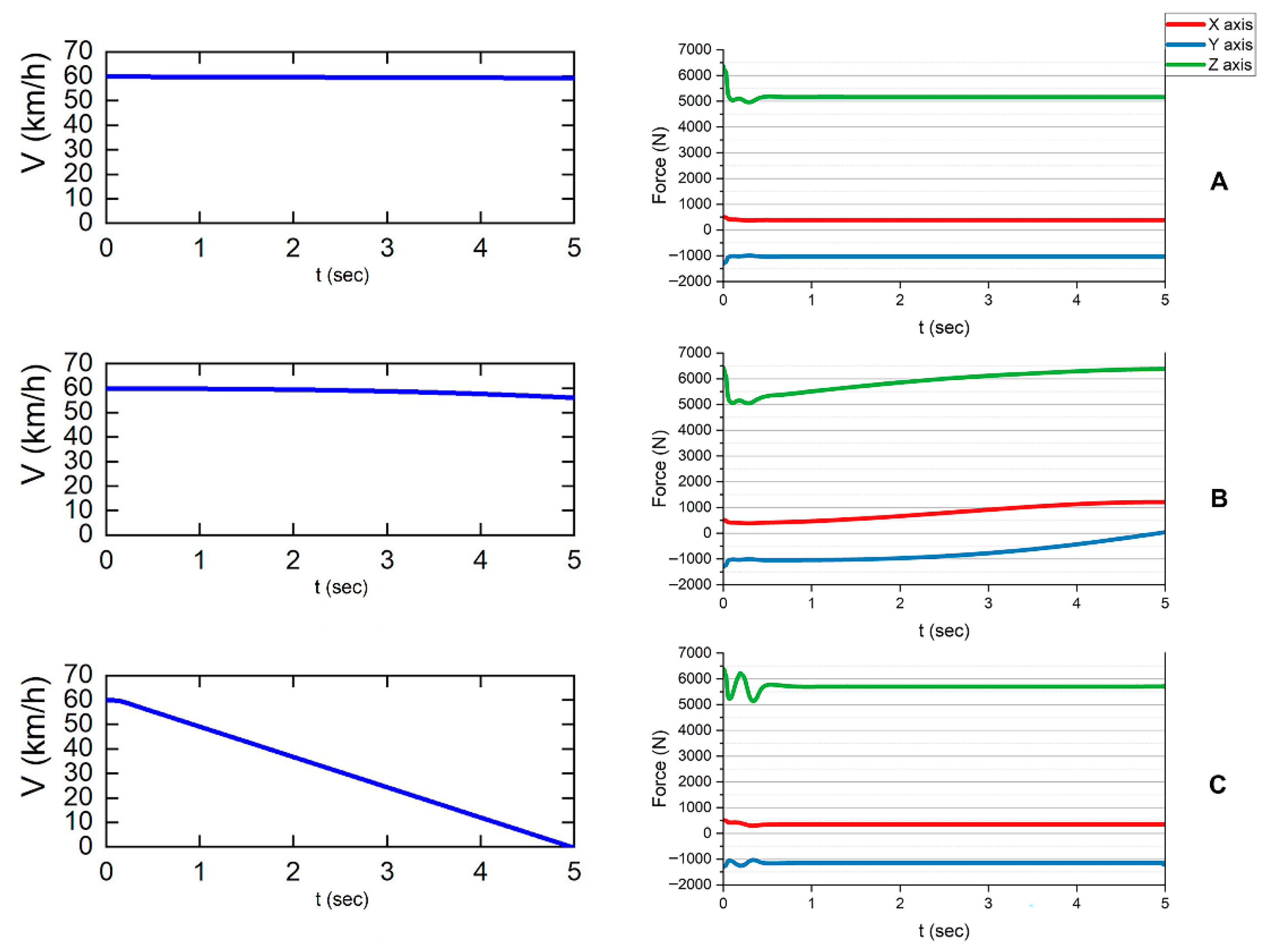 - From the three motion simulations (driving at a constant speed of 60 km/h, climbing a 30° ramp at a constant speed of 60 km/h, and braking to a stop from a speed of 60 km/h within 5 s), it was calculated that the highest force affected the lower wishbone during the ramp climbing motion.