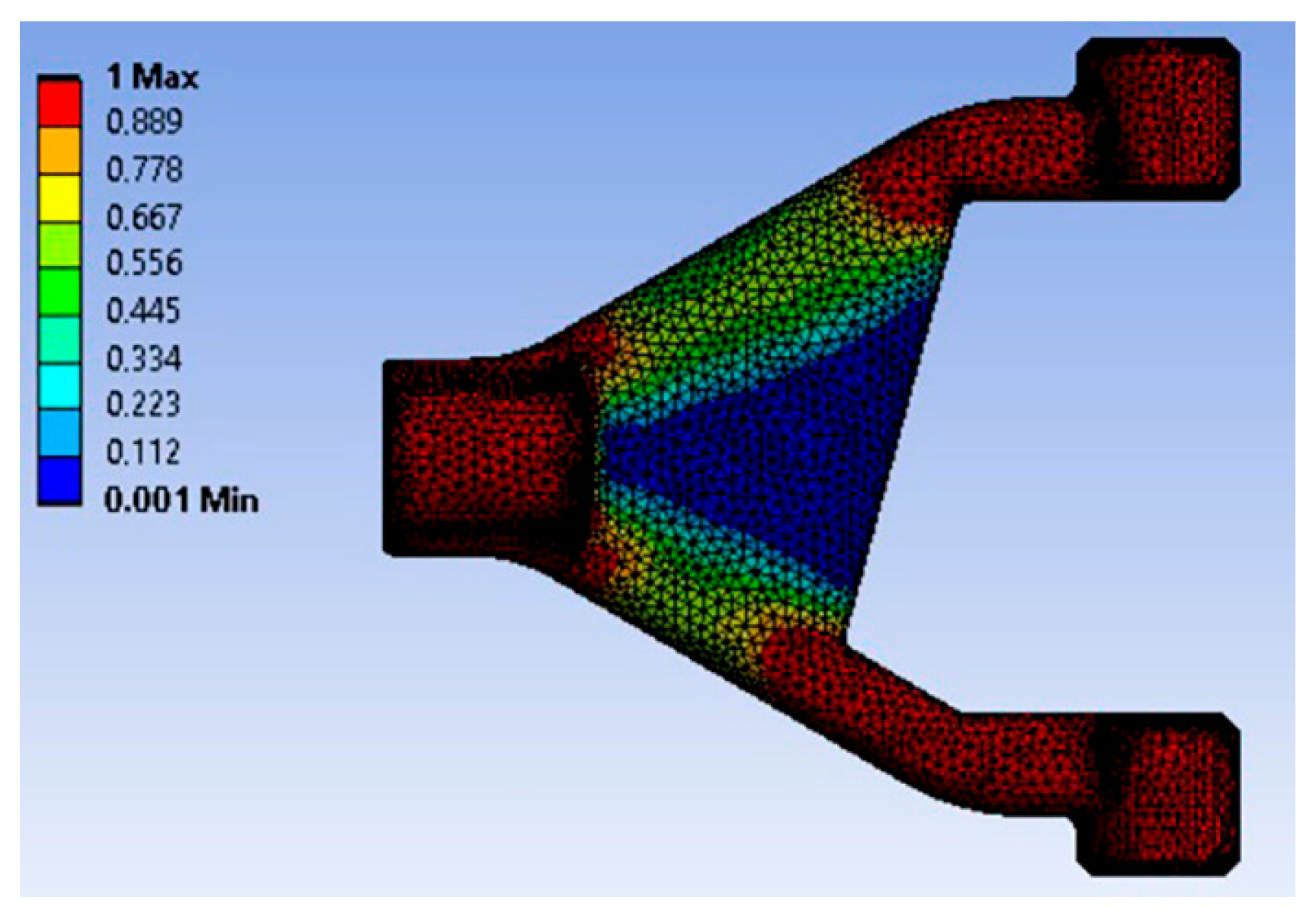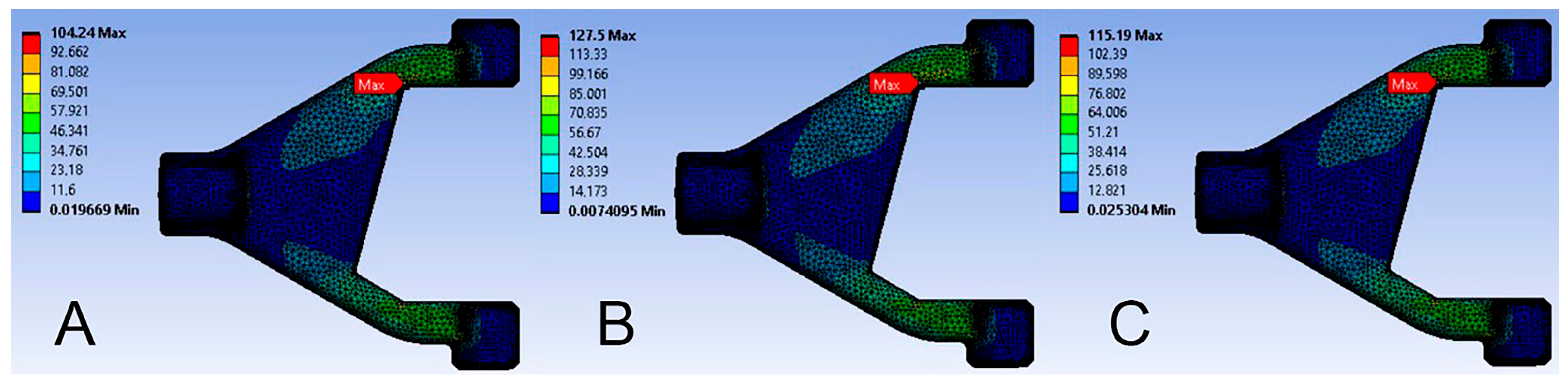 - Kulkarni, V.; Jadhav, A.; Basker, P. Finite Element Analysis and Topology Optimization of Lower Arm of Double Wishbone Suspension Using Radioss and Optistruct. Int. J. Sci. Res. 2014, 3, 639–643. [Google Scholar]