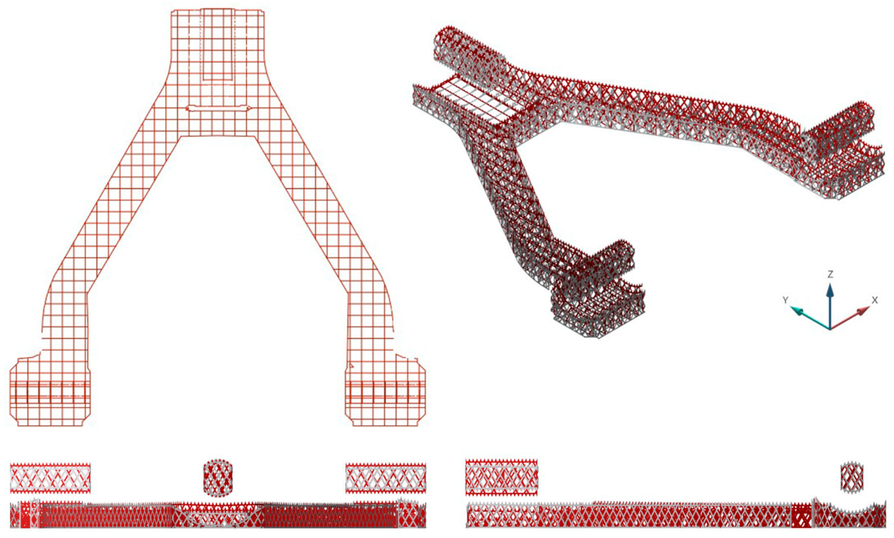 - Optimization was performed for lower von Mises stress, higher natural frequencies, and a more fatigue-safe topology. The emerging part was revised to a smoother geometry, resulting in a 28.5% mass reduction.