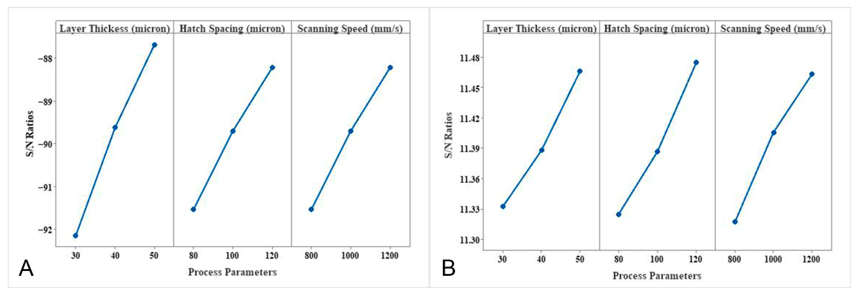 - In the parameter optimization, it was established that the maximum value for all factors produced better results. Nevertheless, employing values exceeding the current three levels could not be considered beneficial for enhancing the results. The parameters, comprising three elements and three levels, were carefully chosen from experimental studies to prevent defects like porous structures and poor surface properties.