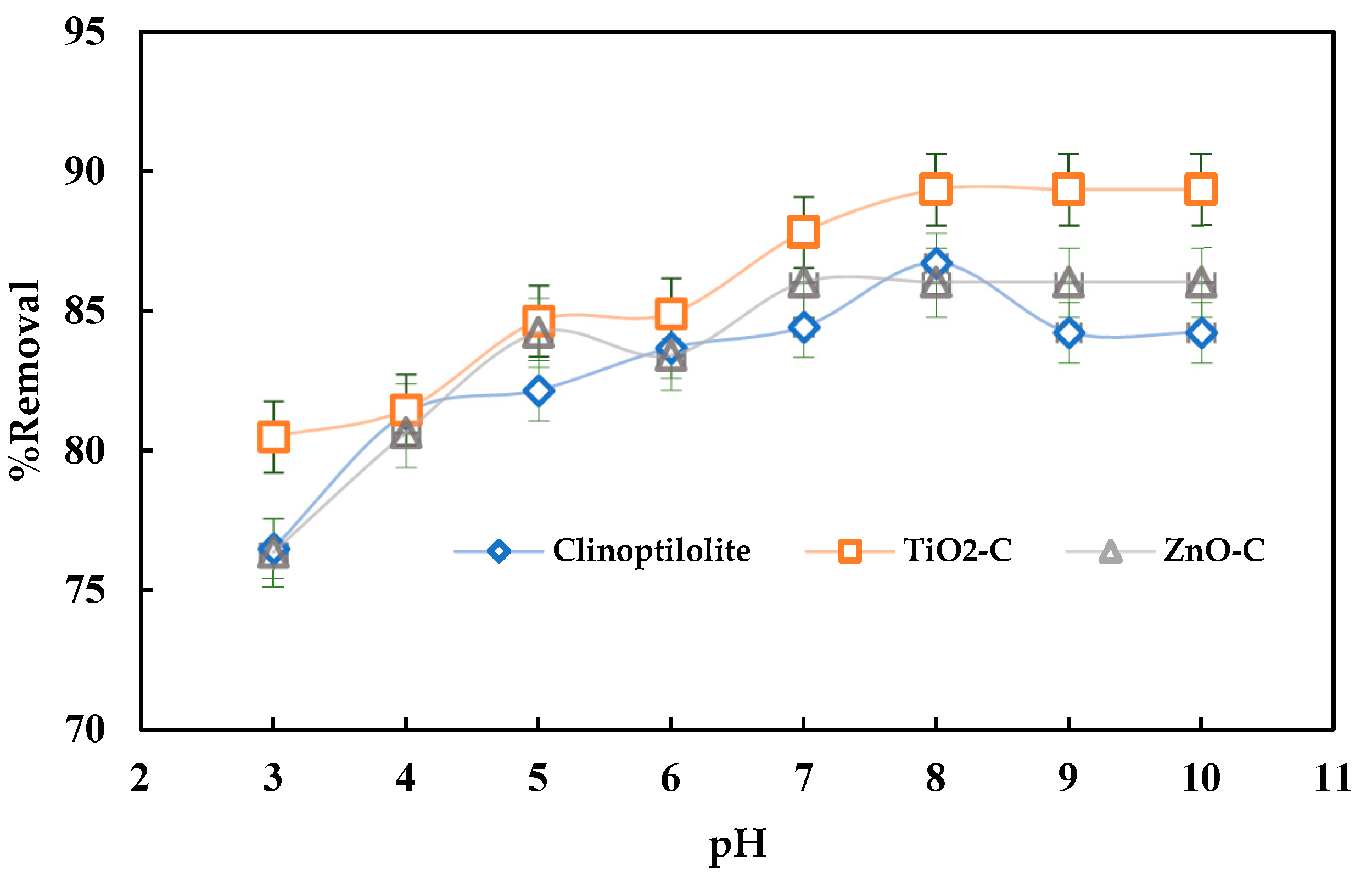 3.2. Effects of pH on the Adsorption of MB