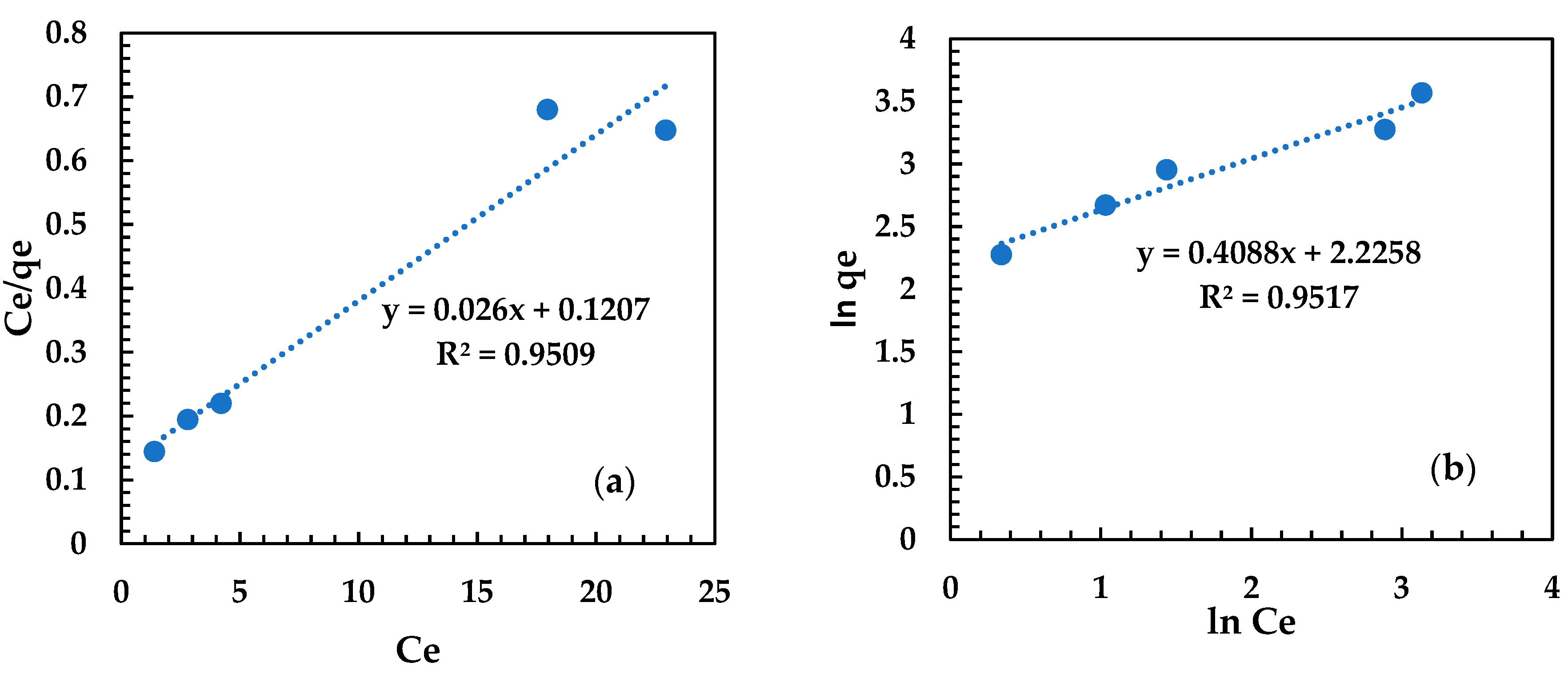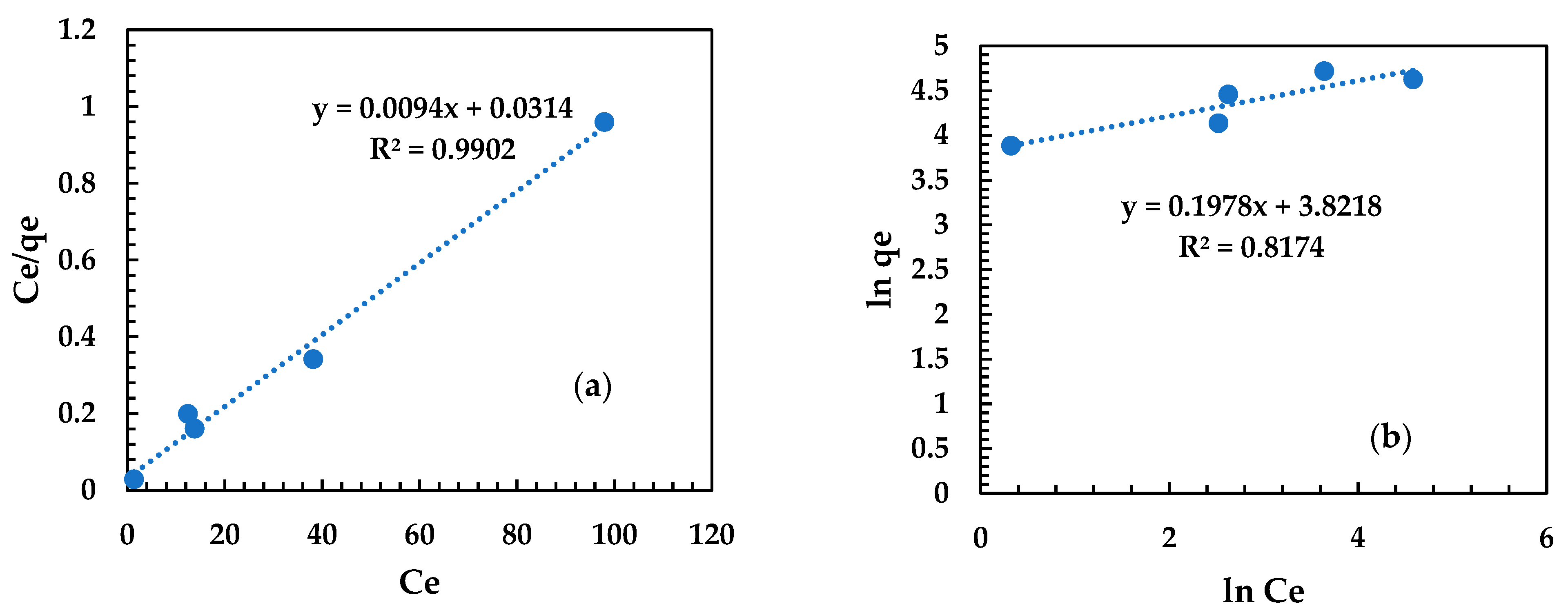 - Ce: equilibrium concentration of MB remaining in the solution after adsorption (mg/L).