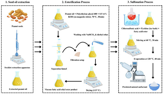 Stepwise synthesis of the natural surfactant from peanut oil via seed-oil extraction, esterification, and sulfonation processes.