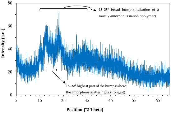 The X-ray diffraction (XRD) pattern of the synthesized nanostructured corn biopolymer presented in Figure 5 shows a broad hump centered around 2θ = 18–22°, suggesting an amorphous or poli-crystalline behavior [41]. With no sharp diffraction peaks, it can be inferred that there is no long-range crystalline order, which is common in biopolymers and indicates the formation of nanoparticles from ball milling [42,43]. The gradual decline in intensity beyond 30° also confirms the disorderly molecular structure characteristic of biopolymeric nanostructures. This amorphous nature can be advantageous in some drilling fluid applications, for example fluid loss control and stabilization, as they achieve enhanced dispersion and interaction with other components [44].