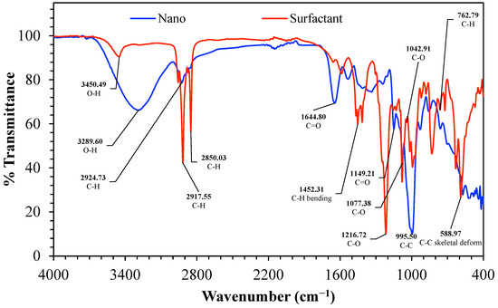 FTIR spectra provided in Figure 6 contrast the nanostructured corn biopolymer (Nano, blue) and the peanut-oil-derived surfactant (Surfactant, red) and confirm the anticipated functionalities in both materials. The Nano spectrum consists mainly of a broad O-H stretching envelope in the region 3600–3000 cm−1, with strong peaks at 3450.49 and 3289.60 cm−1, consistent with hydroxyl-rich polysaccharide backbones and high hydrogen-bonding content [45]. The aliphatic C-H stretching in the same spectrum is weaker and occurs at about 2924.73 cm−1, in accordance with the residual hydrocarbon parts in the biopolymer mixture [46]. The surfactant spectrum features stronger aliphatic features like these with clearest C-H stretching bands at 2917.55 and 2850.03 cm−1 representing the long fatty chain contribution typical of oil derived molecules.