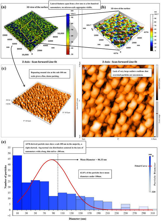 The AFM size histogram derived is shown in Figure 8e and covers mean diameters from 6 to 303 nm, with a weighted mean of 86.33 nm and a distinctively right-skewed, at approximately log-normal behavior. Most particles, 173 of them, are in the small class (<150 nm); 32 are Medium (150–230 nm), and eight are Large (>230 nm). Overall, Sub-100 nm objects predominate more than all detections (63.4%). For example, the sparse, high-diameter tail out to 300 nm suggests that oversized outlier is rare and does not influence the statistics. By thus matching together the plan-view texture with the histogram, it is therefore consistent; a dense but non-coalesced group of nano-grains that lies within 85–90 nm of center and has almost no polydispersity at the top. This morphology suggests a high interfacial area per unit volume and multiple nanoscale contact points. The particle population should diffuse easily, stabilize colloids efficiently, and contribute predictably to the flow and filtration dynamics of CGA drilling fluids while avoiding large, defect-forming agglomerates [51,52].