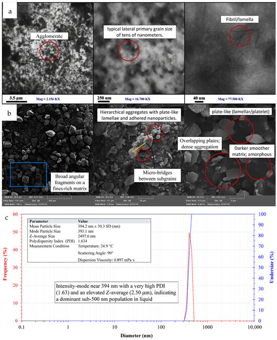 The SEM micrographs (Figure 9b) build on this by demonstrating similar platelet-dominant habits in the dry state at larger lateral scales. The platelets are densely packed and irregular with sharp edge surfaces. These platelets tend to tile, overlap, and form clusters which look like flakes. This dense packing shows that the particles are strongly sticking together probably because hydrogen bonds are forming between the hydroxyl-rich biopolymer moieties as they dry [54]. The background looks smoother and darker compared to the brighter platelets. This indicates that there may exist an amorphous or less-ordered phase that links the bright lamellae and forms contiguous domains [55]. TEM and SEM demonstrate that lamellar is the dominant morphology allowing mesoscale aggregates to assemble.