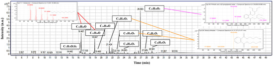 GC-MS TIC of the peanut-oil-derived surfactant with key peaks annotated and representative EI spectra insets, highlighting putative alkane and fatty-acid-ester features and later phthalate-type signals.