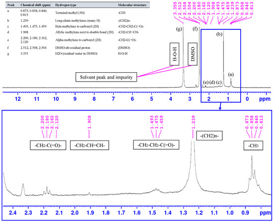 1H NMR spectrum of the synthesized peanut-oil-derived surfactant (DMSO-d6) with peak assignments.
