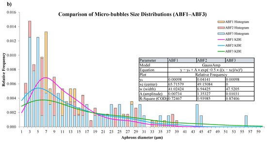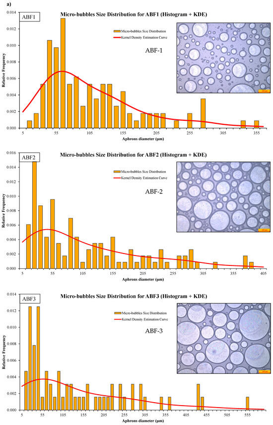 Microscopic images and size-distribution histograms of aphrons in (a) ABF1, ABF2, and ABF3, and (b) comparison of aphron size distributions across ABF1, ABF2, and ABF3 using kernel-density estimation (KDE).