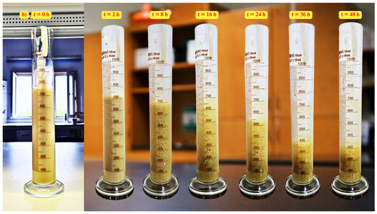 The microscopic evolution of ABF2 over 120 min is shown in Figure 13a. As time progressed, bubbles gradually coalesced and enlarged, resulting in a wider size distri-bution and a noticeable decline in bubble count [73]. Figure 13b shows the reduction in volume of ABF2 throughout 48 h. The initial volume of 750 mL steadily declined as aphrons began to coalesce and collapse, yet foam continued to persist significantly be-yond 24 h, indicating good temporal stability [74].