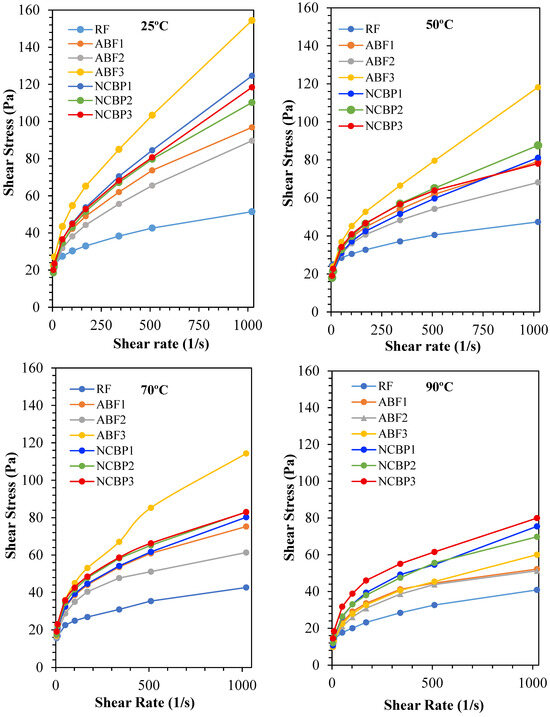 Shear stress vs. shear rate profiles of all drilling fluid formulations at 25 °C, 50 °C, 70 °C, and 90 °C.
