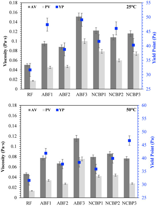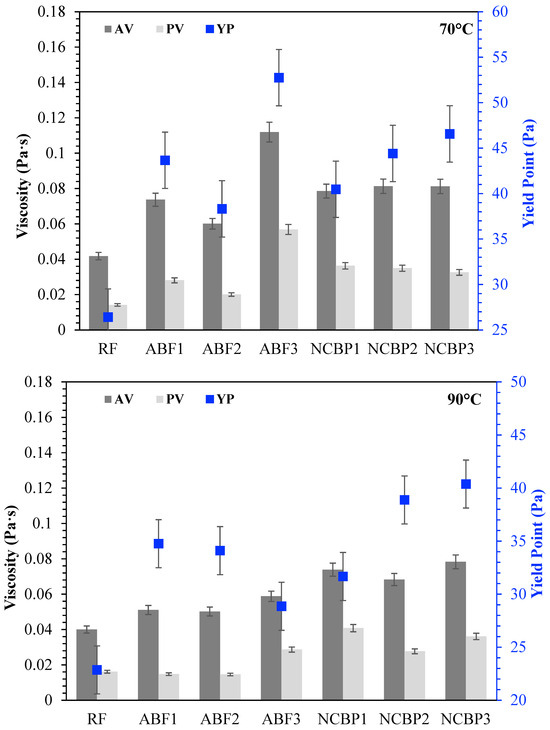Apparent viscosity (AV), plastic viscosity (PV), and yield point (YP) of all drilling fluid formulations at 25 °C, 50 °C, 70 °C, and 90 °C.