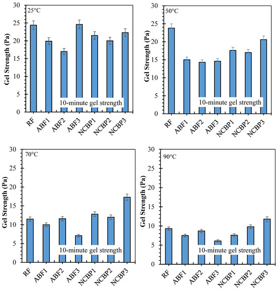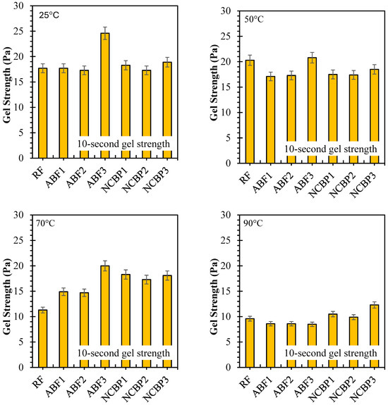 10 s and 10 min gel strengths have been reported for seven formulations from 25 °C to 90 °C, respectively, in Figure 16 showing solids-suspension capacity under static conditions and thermal stress. Strong gels formed at 25 °C were obtained across the fluids which was observed for ABF3 (24.6 Pa at 10 s and 10 min), indicating that in high surfactant content a dense foam network was established. Next up was NCBP3 (18.9 Pa at 10 s; 22.3 Pa at 10 min), further supporting the structural contribution made by the nanostructured corn biopolymer. RF also showed high initial gels that reached 17.7 Pa and 24.4 Pa probably due to an undisturbed bentonite structure. Gel strengths decreased in all systems with increasing temperature, with the most pronounced reductions at 70 °C and 90 °C. For ABF3, values decreased to 9.6 Pa (10 s) and 7.5 Pa (10 min) at 90 °C, retaining 39.0% and 30.5% of the room temperature values. NCBP3 had the highest gels at 90 °C (12.3 Pa:10 s and 11.8 Pa:10 min) for a retention of 65.1% and 52.9%, respectively. On the other hand, NCBP1 and NCBP2 were better than the surfactant-only ABFs at high temperature. Nanobiopolymer-based fluids such as NCBP3 overall maintained a better thermal stability over both short-term and long-term gel strengths, indicating the ability of nanostructured corn biopolymer to reinforce the microstructure and maintain gels for longer than aphron-only or conventional bentonite systems at high temperatures.