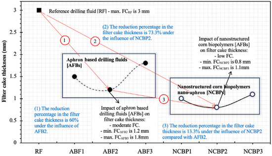Measured thicknesses of the obtained filter cakes for the reference drilling fluid (RF), aphron drilling fluid (ABF1, ABF2 and ABF3), and nanostructured corn biopolymer drilling fluid (NCBP1, NCBP2 and NCBP3).