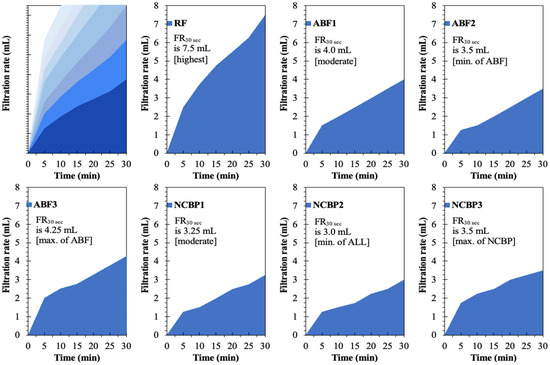 Figure 18 presents the time-dependent filtration behavior of the reference fluid (RF), aphron-based drilling fluids (ABFs), and nanostructured corn biopolymer-enhanced aphron fluids (NCBPs) under API (LTLP) conditions. The filtration curves clearly demonstrate the progressive improvement in fluid-loss control achieved through aphron generation and subsequent nanobiopolymer reinforcement. The reference fluid (RF) exhibits the highest filtration rate throughout the test, reaching a total filtrate volume of 7.5 mL after 30 min, which is the maximum among all formulations. The steep initial slope within the first few minutes indicates rapid filtrate invasion before a stable filter cake is formed. This behavior is characteristic of conventional bentonite-based fluids, where rigid particles require longer times to bridge pore throats and establish an effective seal. In contrast, the aphron-based fluids show a marked reduction in both early-time and cumulative filtration. Among the ABFs, ABF2 demonstrates the lowest filtrate volume (3.5 mL), representing the best performance within the aphron-only systems. This reduction reflects the ability of aphrons to rapidly migrate to the filtration interface and form a deformable, low-permeability barrier that limits fluid invasion from the early stages of filtration. ABF1 and ABF3 display higher filtrate volumes (4.0 and 4.25 mL, respectively), indicating that aphron performance is strongly dependent on surfactant concentration. Excessive surfactant loading in ABF3 likely promotes aphron coalescence and size heterogeneity, which weakens sealing efficiency and increases filtrate flow.