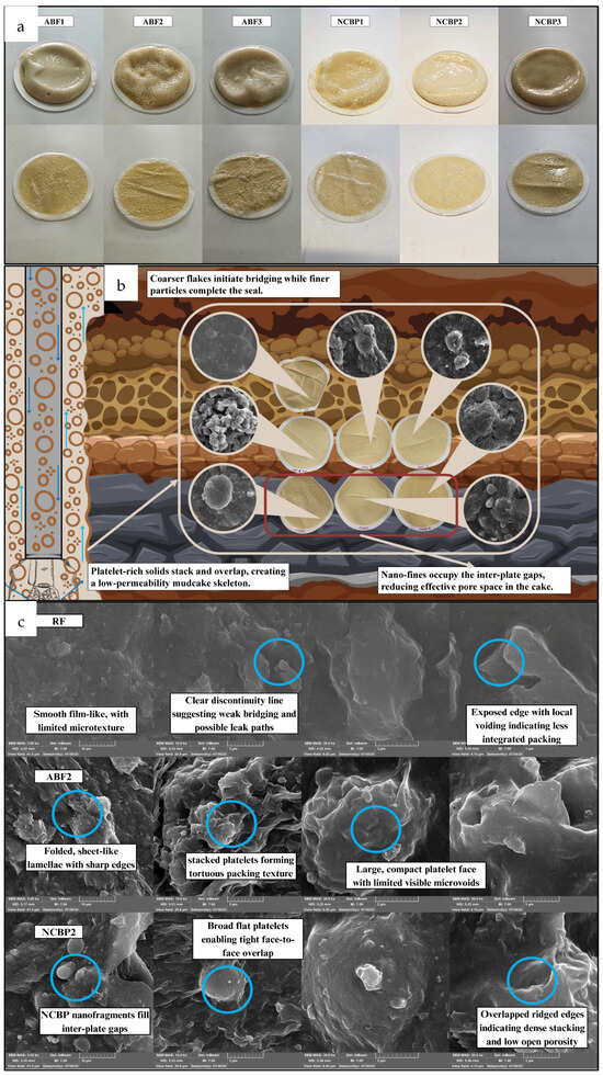 A further and more pronounced reduction in filter-cake thickness was achieved with the incorporation of nanostructured corn biopolymers (NCBPs). Compared with ABF2, the addition of nanobiopolymer led to an additional 13.3% reduction in cake thickness, with NCBP2 producing the thinnest and most compact cake (0.8 mm). Overall, this corresponds to a 73.3% reduction relative to the reference fluid, highlighting the strong synergistic effect between aphrons and nanostructured biopolymers. The superior performance of NCBP2 can be explained by a combined sealing mechanism. While aphrons provide macro- and micro-scale deformable bridging, the nanostructured corn biopolymer acts as a fine filler that occupies interstitial voids within the aphron network and between bentonite platelets. This dual-scale sealing mechanism results in a denser, less permeable filter cake with reduced thickness. In contrast, higher nanobiopolymer loading (NCBP3) led to a slight increase in cake thickness (1.1 mm), likely due to nanoparticle agglomeration and excessive viscosity, which can hinder optimal particle packing and aphron mobility. In other words, beyond the optimum (1 wt.%), excessive NCBP can promote a thicker, less favorably packed cake and reduce aphron transport to the sealing interface, which offsets the expected filtration gains.