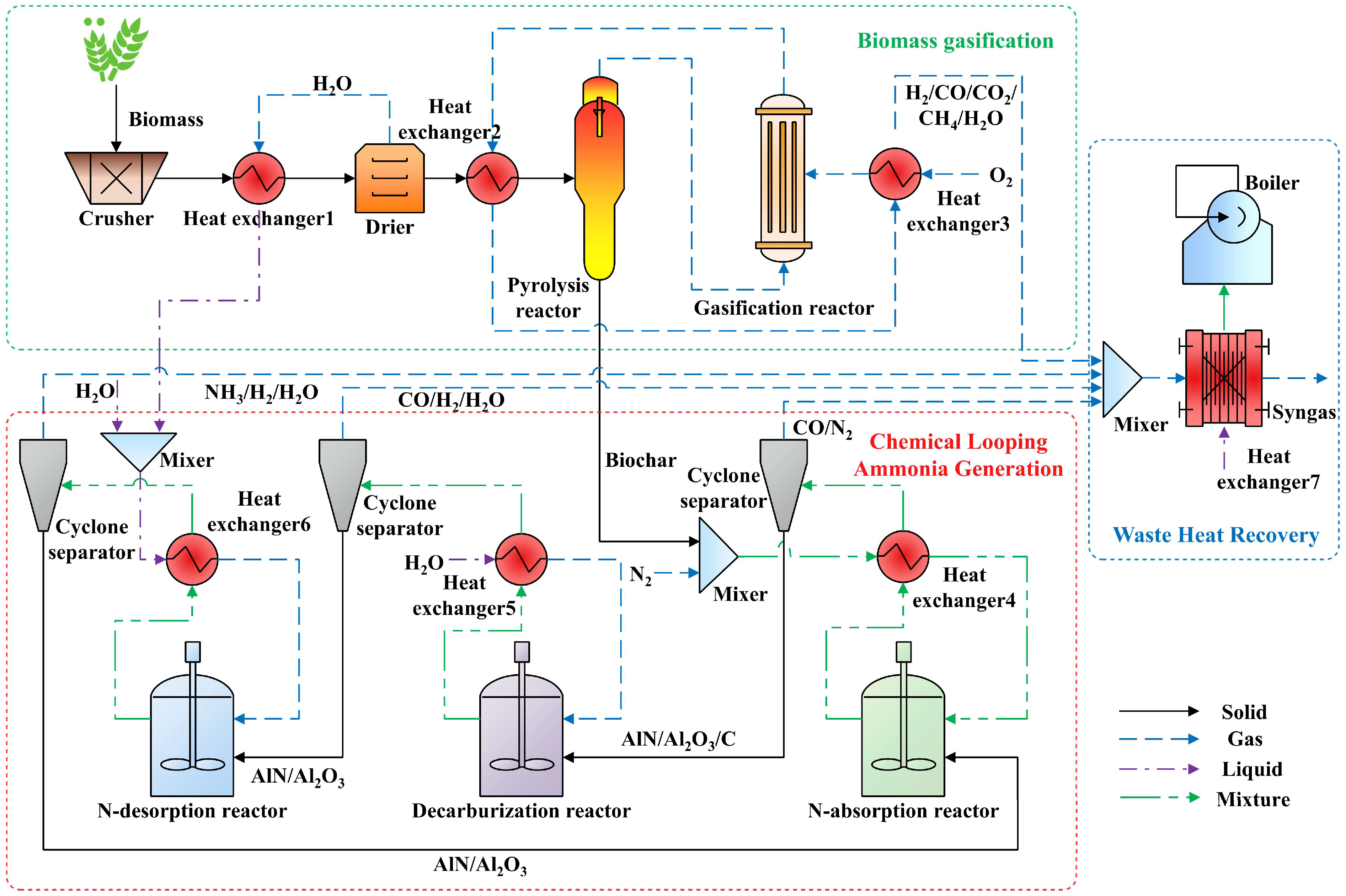 - Weng, Q.; Toan, S.; Ai, R.; Sun, Z.; Sun, Z. Ammonia production from biomass via a chemical looping-based hybrid system. J. Clean. Prod. 2021, 289, 125749. [Google Scholar] [CrossRef]