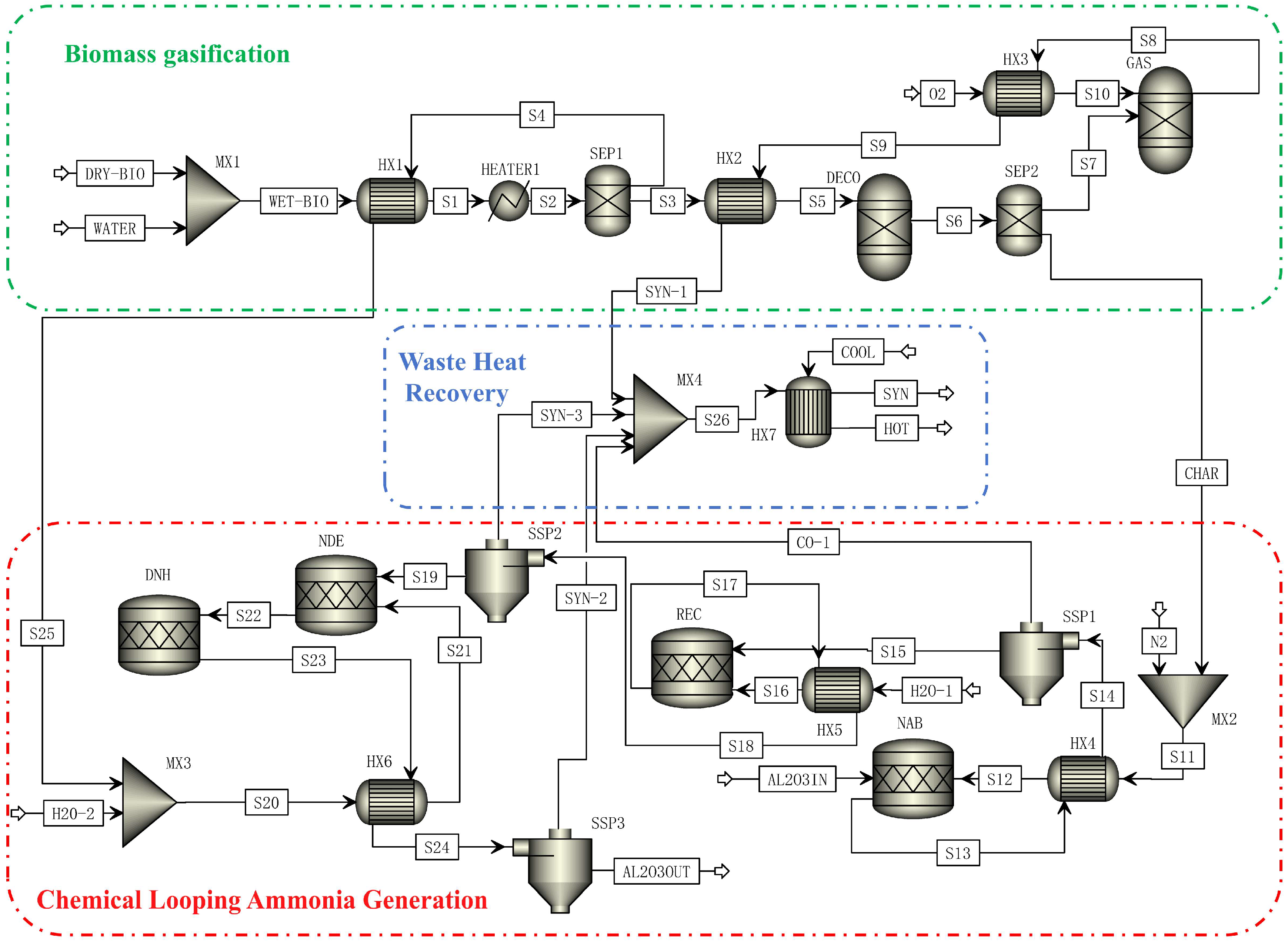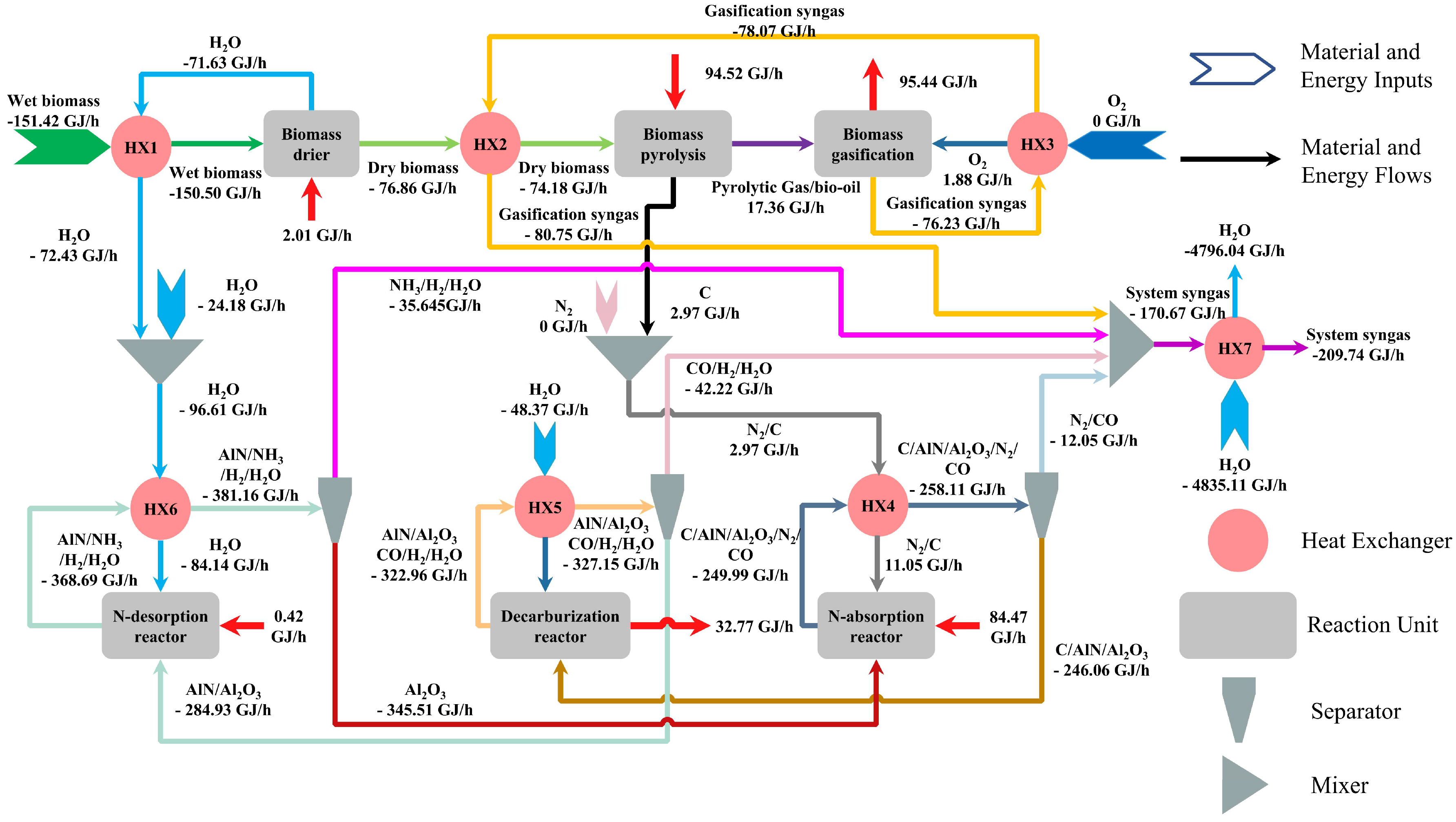 Liu, Z.; Yu, Q.; Xie, H.; Luo, L.; Chen, Z.; Yu, G.; Wang, C. Process Design and Kinetic-Based Simulation of a Coupled Biomass Gasification and Chemical Looping Ammonia Generation System. Processes 2026, 14, 588. https://doi.org/10.3390/pr14040588