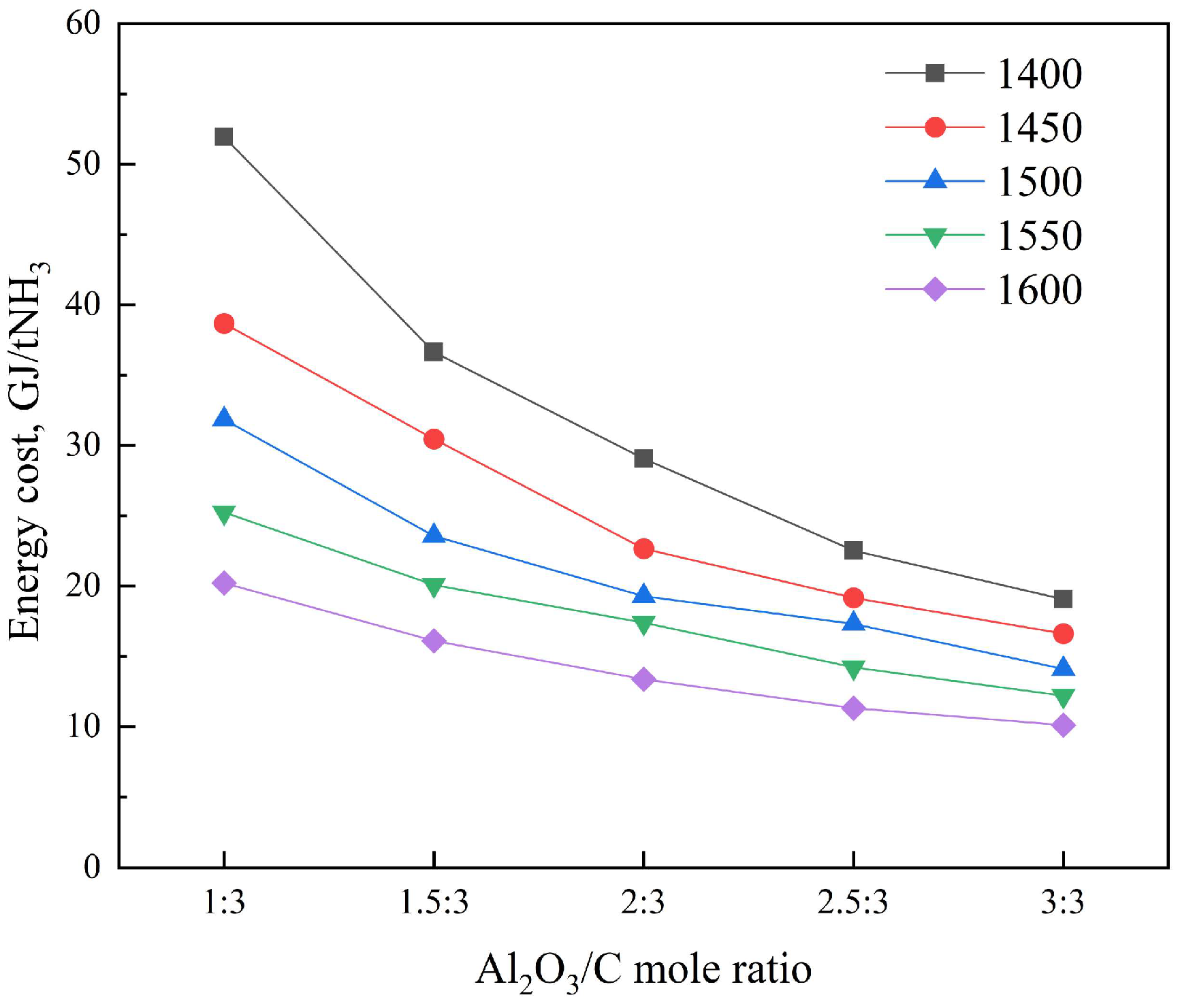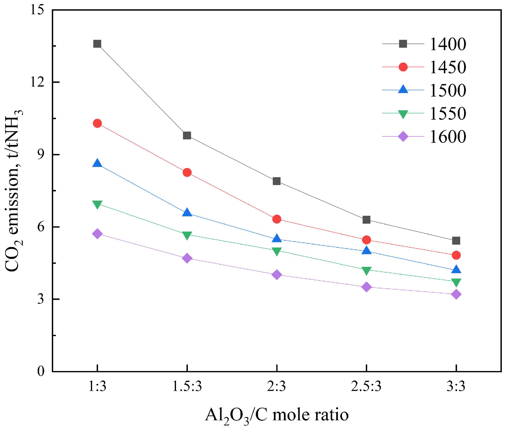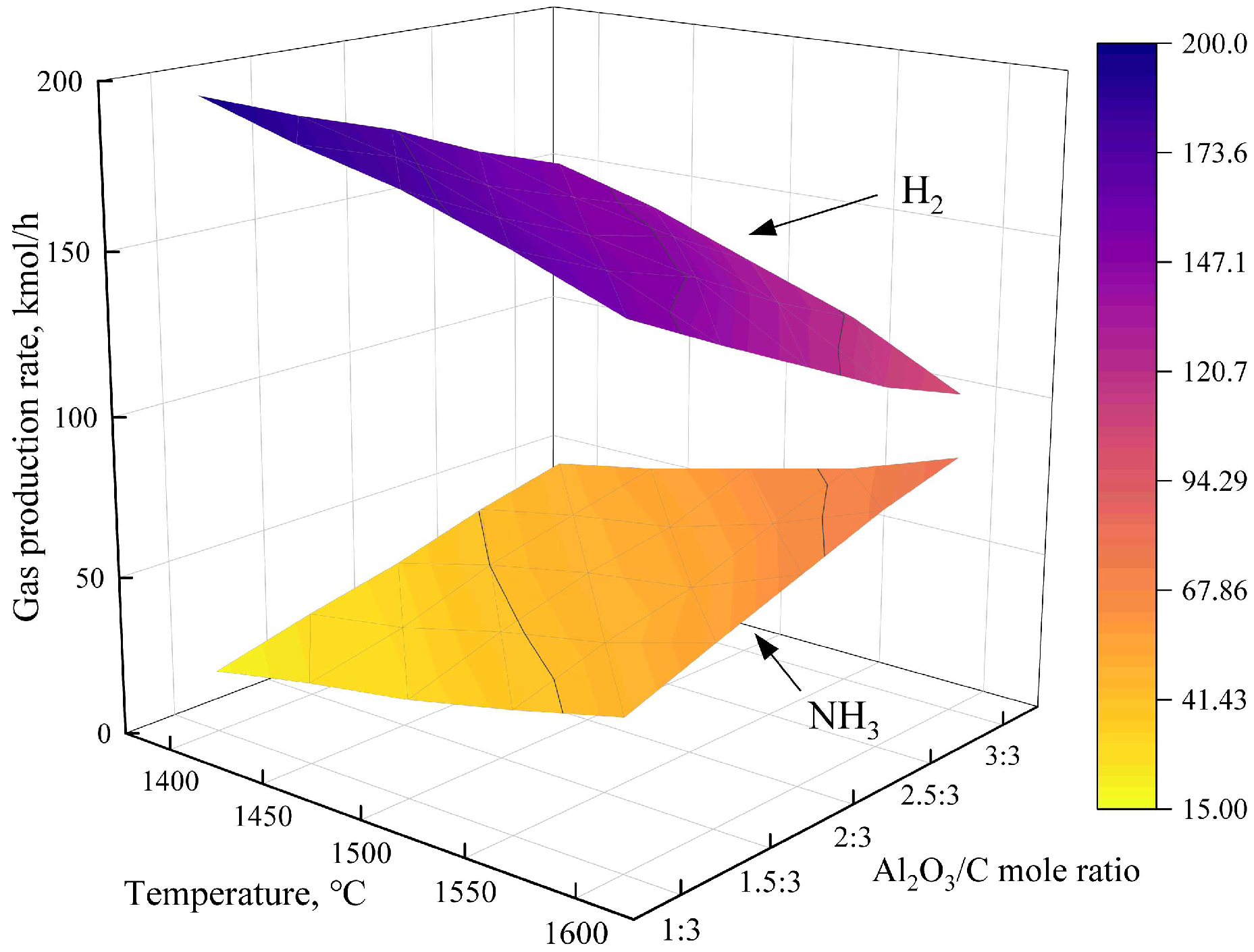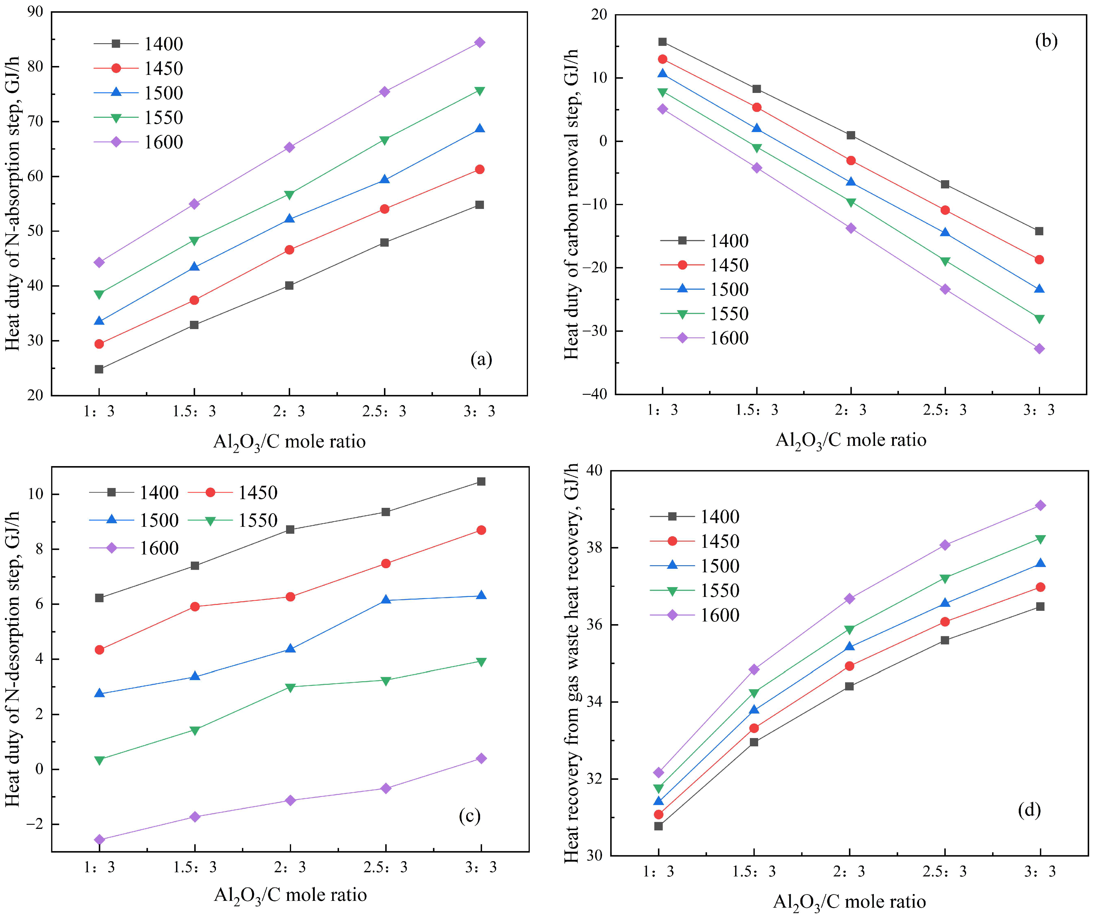 | Temperature, °C | α-Al2O3:C | C Conversion, % | Mass Fraction of α-Al2O3, % | NH3 Decomposition Rate, % |